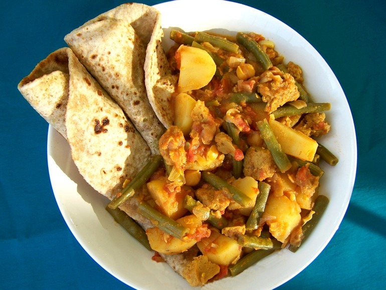 Snipper de ui en de knoflooktenen. Fruit deze even aan in een goede laag olie. Zelf vind ik het lekker om wokolie te gebruiken omdat hier al veel lekkere aroma's aan zitten. De Surinaamse keuken ligt ook dicht tegen de Hindoestaanse / Javaanse keuken aan, we zien veel invloeden hieruit. Die smaken gaan daarom ook goed samen. Ondertussen snijd je de kip in middelgrote stukken. Als je de uien en de knoflook een minuutje hebt gefruit mag je ze eruit halen en gaan we de kip aanbakken. Schroei de kip aan de zijkanten dicht. De kip hoeft nog niet gaar te zijn, dat komt straks als de bouillon erbij komt en de aardappels. Snijd de aardappels in kleinere stukken. Als de kip goed aangebakken is gooi je de uien en knoflook en samen met de aardappels weer in de wokpan. Bak alles even goed aan en doe de scheppen masala kruiden erbij. Voeg beetje bij beetje de bouillon toe. De kip en aardappelen mogen niet geheel onder de bouillon staan. Als laatste voeg je de madame jeanette peper toe. Pas op, deze moet je heel toevoegen en blijf constant je gerecht proeven. Als de madame jeanette peper openbreekt dan wordt de roti heel snel heel pittig. Blijf ondertussen de bouillon toevoegen totdat de aardappels gaar zijn, dat zal ongeveer 30 - 40 minuten duren. Blijf tussendoor vooral heel veel proeven, als je meer smaak nodig hebt kun je of meer masala kruiden, peper en zout of wat extra bouillon toevoegen. Als laatste aan het gerecht voeg je de kouseband toe. Deze maak je eigenlijk hetzelfde als snijbonen, hier lijken ze qua structuur ook wel een beetje op. Je snijdt ze in stukken van 3 a 4 cm en doet ze een kwartier voor het einde erbij. Als je ze knapperiger wilt kan je ze ook wat later toevoegen. Kook ondertussen de eieren hard in ongeveer 10 minuten. Laat ze even afkoelen in ijskoud water en pel de schil er af en bak ze daarna in een pan met een laagje olie. Probeer ze goed te draaien zodat ze in zijn geheel lekker bruin worden. De roti vellen kan je even opwarmen in de pan of in de magnetron, afhankelijk van je mogelijkheden in de keuken.